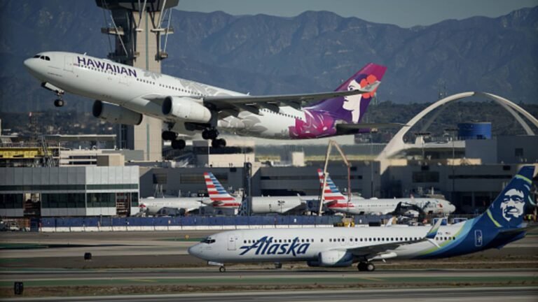 An Alaska Airlines plane and a Hawaiian Airlines plane at Los Angeles International Airport in Los Angeles on Dec. 5, 2023.