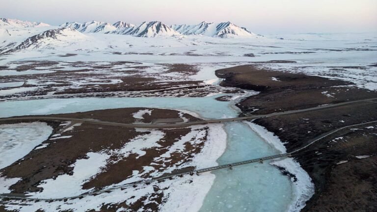 An aerial view of the Dalton Highway and a portion of the Trans Alaska Pipeline System (TAPS) crossing over the frozen Atigun River during the early morning hours of May 9, 2025 about 22 miles north of Atigun Pass in North Slope Borough, Alaska.