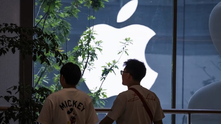 Two young men stand inside a shopping mall in front of a large illuminated Apple logo seen through a window in Chongqing, China, on June 4, 2025.