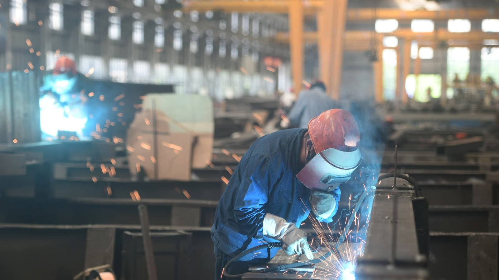 HANGZHOU, CHINA – JUNE 30, 2025 – A worker is working in the production workshop of a steel structure factory in Hangzhou City, Zhejiang Province, China on June 30, 2025.