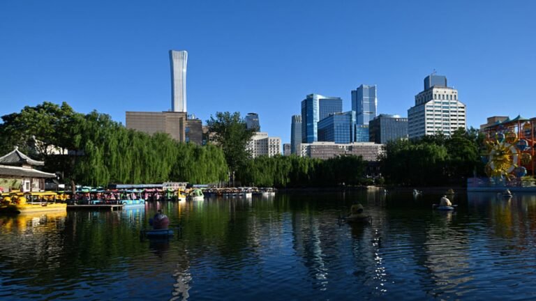 High rise buildings, including the China Zun or CITIC Tower (L, back) is seen at the Central Business Distric (CBD) from the Tuanjiehu park in Beijing on June 2, 2025.