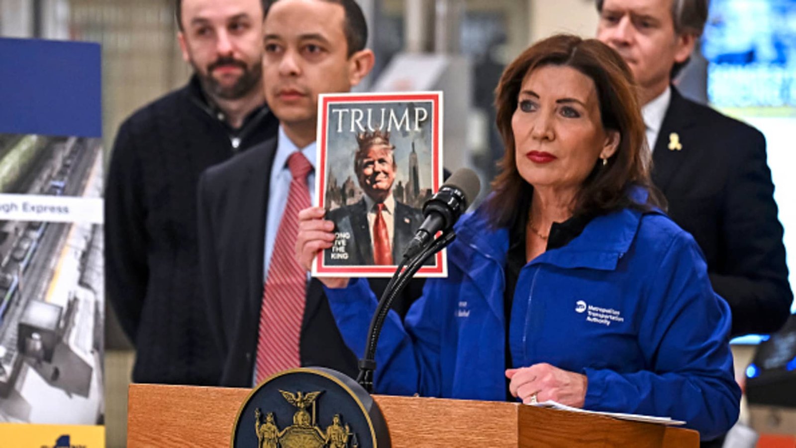 New York Governor Kathy Hochul (C) holds a picture of US President Donald Trump during a press conference at Grand Central Terminal on Feb. 19, 2025 in New York City.