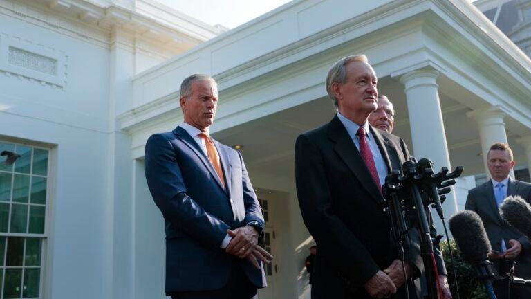 Senate Majority Leader John Thune (R-SD), left, listens to Sen. Mike Crapo (R-ID), center, chair of the Senate Finance Committee, speak to reporters outside of the West Wing of the White House on June 4, 2025.