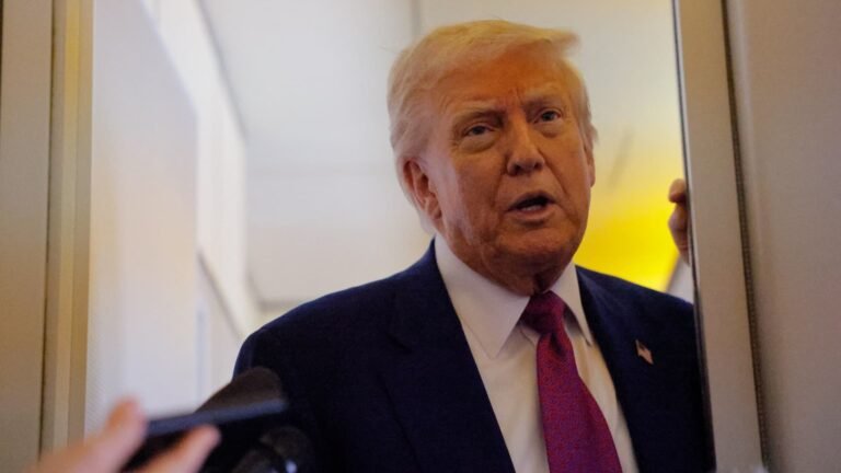 U.S. President Donald Trump talks to reporters aboard Air Force One, en route to Abu Dhabi, United Arab Emirates, on May 15, 2025.