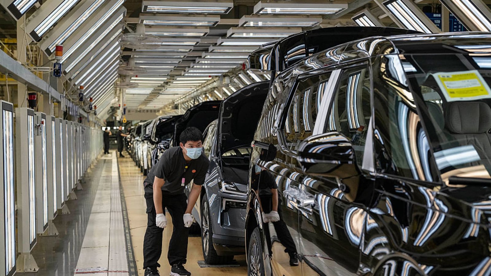 A worker checks a finished vehicle on the production line for electric vehicle maker Zeekr at its factory on May 29, 2025 in Ningbo, China.
