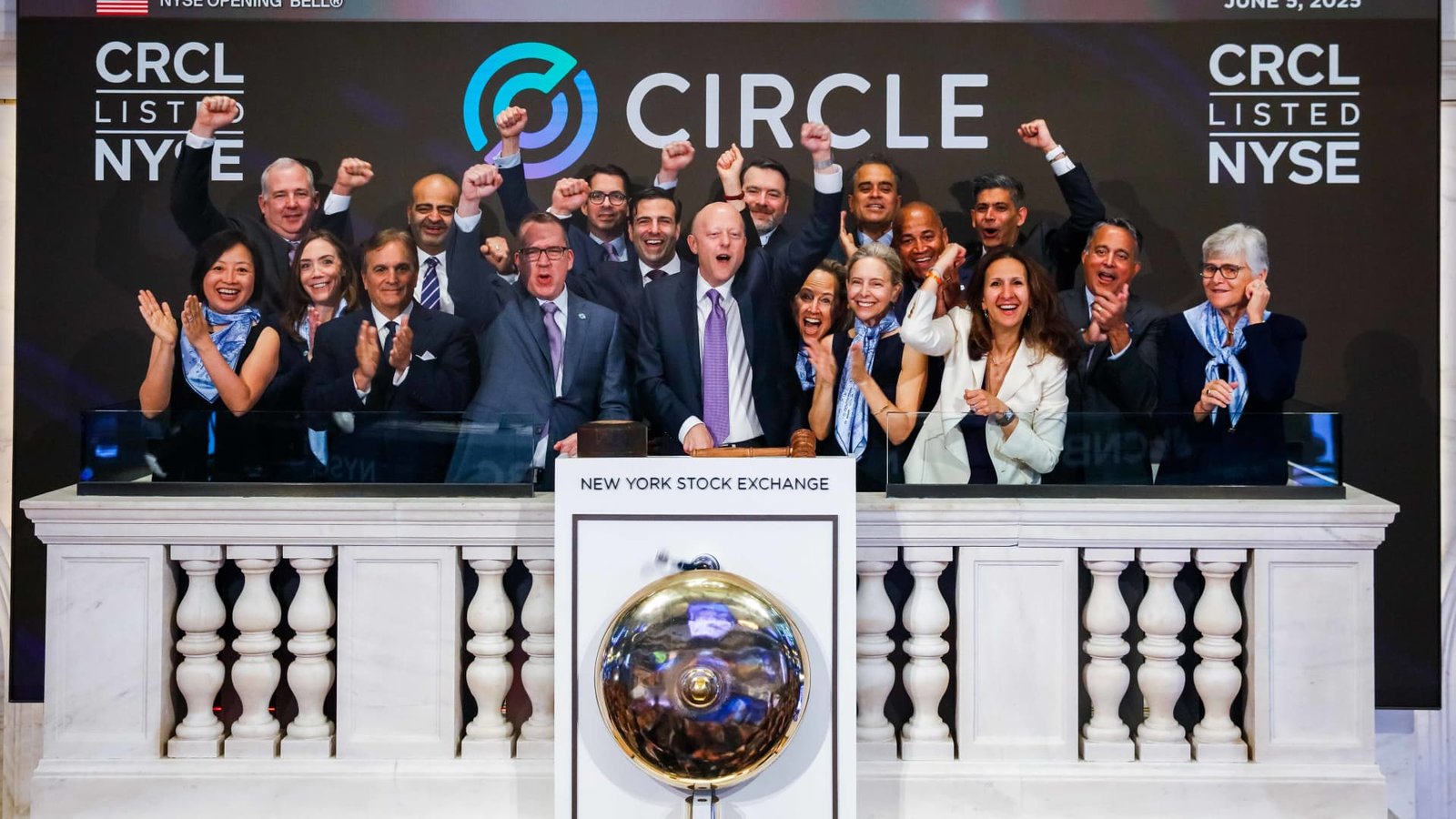 Jeremy Allaire, CEO and co-founder of Circle Internet Group, the issuer of one of the world’s biggest stablecoins, and Circle Internet Group co-founder Sean Neville react as they ring the opening bell, on the day of the company’s IPO, in New York City, U.S., June 5, 2025.