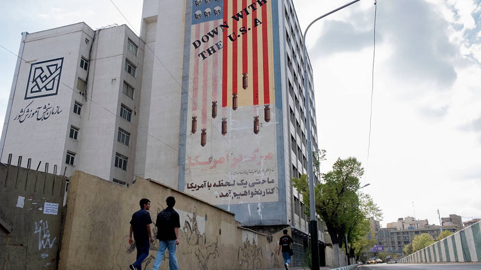 A famous mural that depicts the flag of the United States of America with bombs and skulls and reads “Down with the U.S.A.” in central Tehran, Iran, on March 31, 2025.