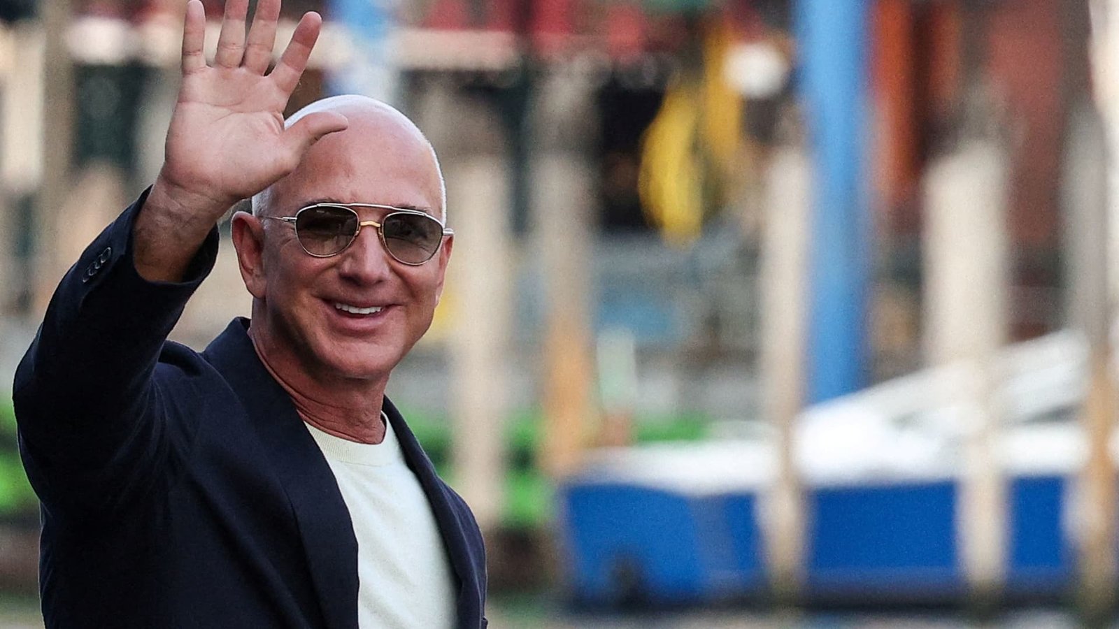 Jeff Bezos gestures as he leaves Aman Venice hotel, ahead of their expected wedding, in Venice, Italy, June 25, 2025.