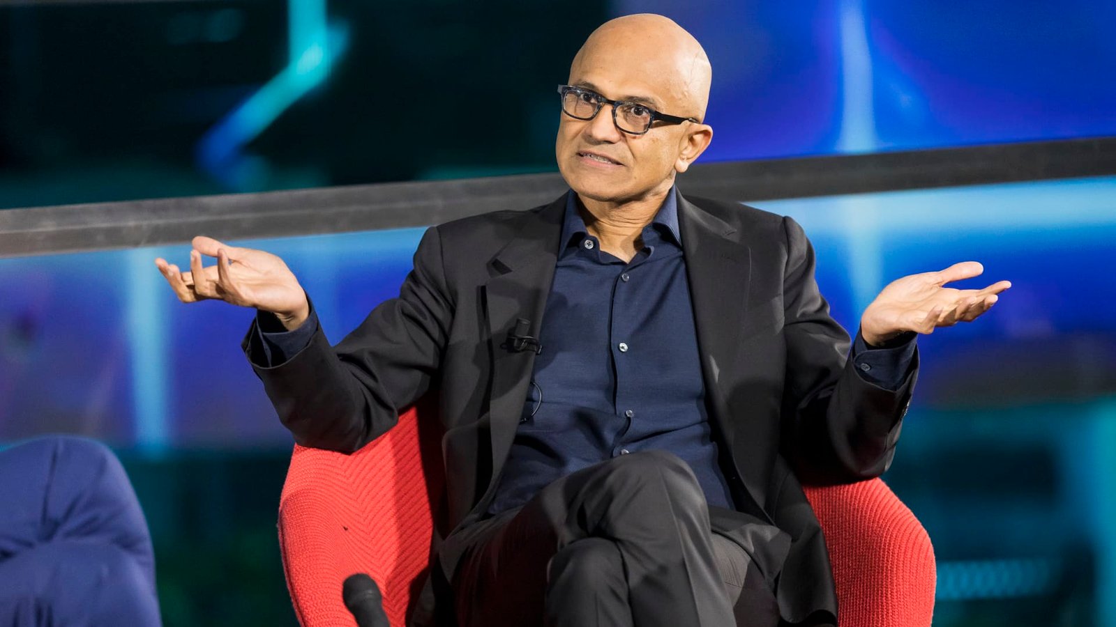 Microsoft CEO Satya Nadella speaks at the Axel Springer building in Berlin on Oct. 17, 2023. He received the annual Axel Springer Award.