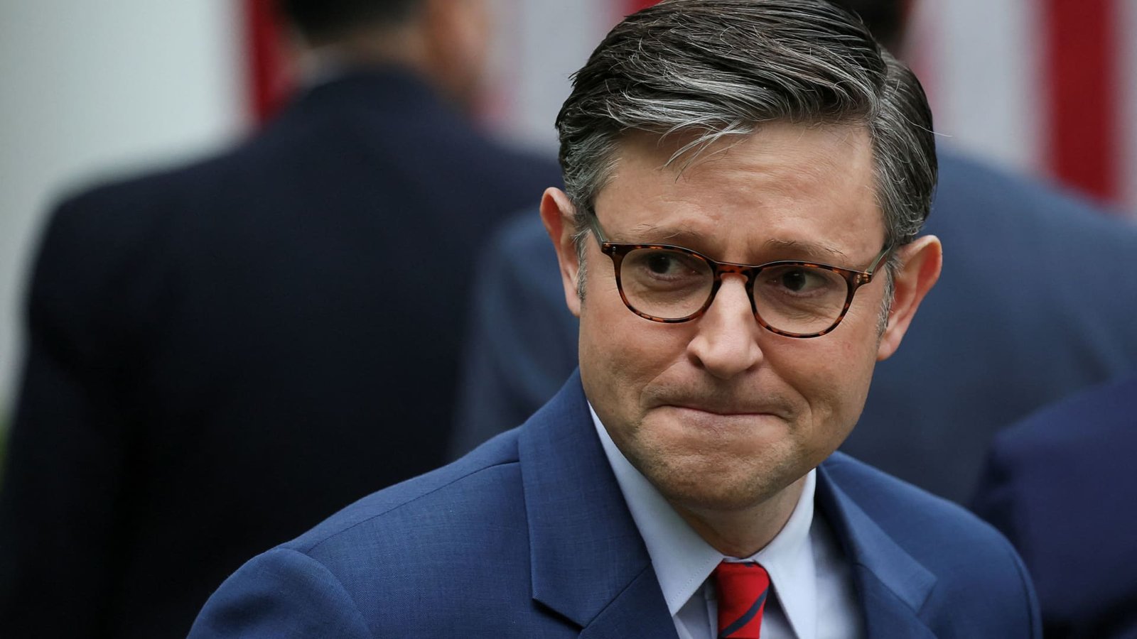 U.S. House of Representatives Speaker Mike Johnson (R-LA) looks on, after President Donald Trump delivered remarks on tariffs, in the Rose Garden at the White House in Washington, D.C., U.S., April 2, 2025.
