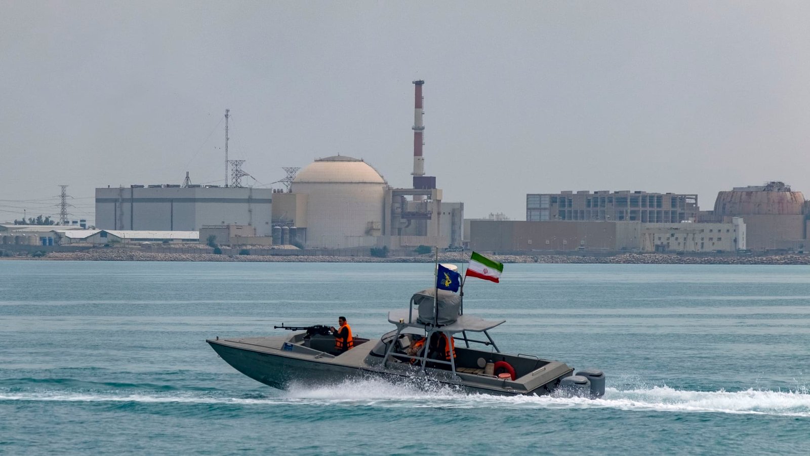 An Islamic Revolutionary Guard Corps speed boat sailing along the Persian Gulf during the IRGC marine parade to commemorate Persian Gulf National Day, near the Bushehr nuclear power plant in the seaport city of Bushehr, in the south of Iran, on April 29, 2024.