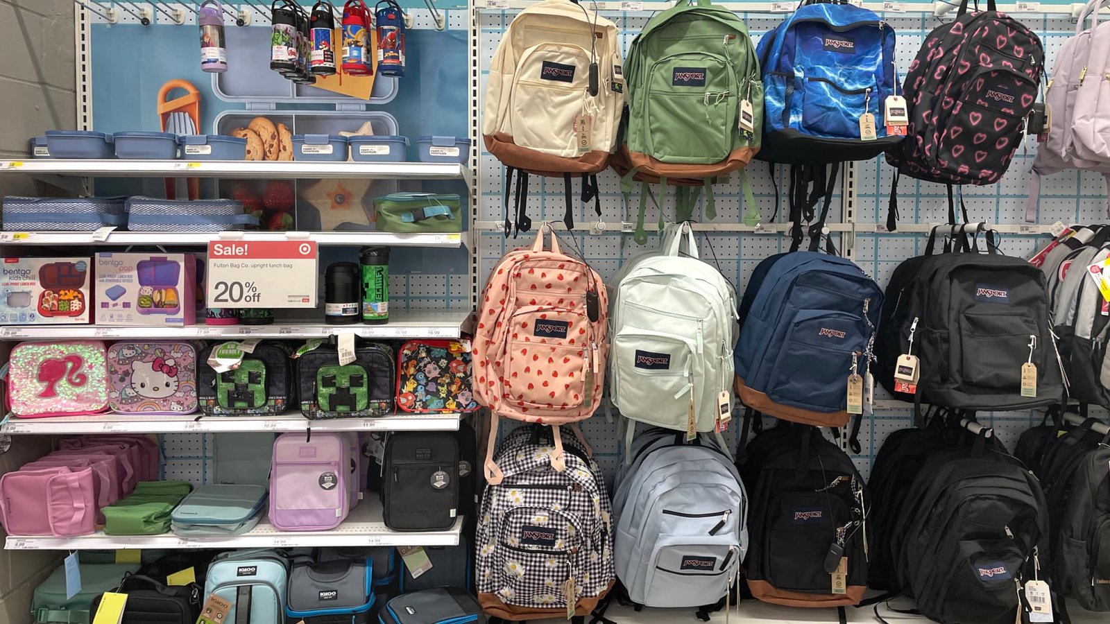 A variety of school supplies, including lunch boxes and backpacks in different colors and patterns, are on display for the upcoming school year.