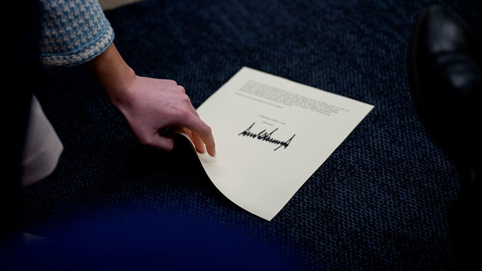 WASHINGTON, DC – JULY 7: An aide picks up a page from a letter to Japan and South Korea, signed by U.S. President Donald Trump, announcing 25% tariffs beginning on August 1st, during the daily press briefing in the Brady Press Briefing Room at the White House on July 7, 2025 in Washington, DC.