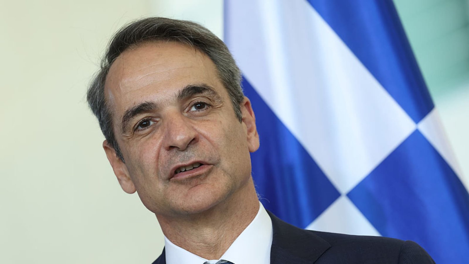 Greek Prime Minister Kyriakos Mitsotakis and German Chancellor Friedrich Merz (not pictured) speak to the media following talks at the Chancellery on May 13, 2025 in Berlin, Germany.