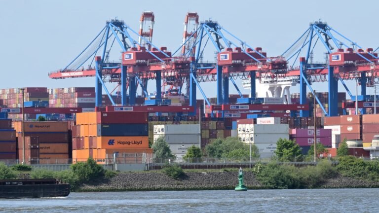 Cargo shipping containers wait to be loaded by cranes on container ships at the Burchardkai container terminal at the harbour of Hamburg, northern Germany, on June 3, 2025.